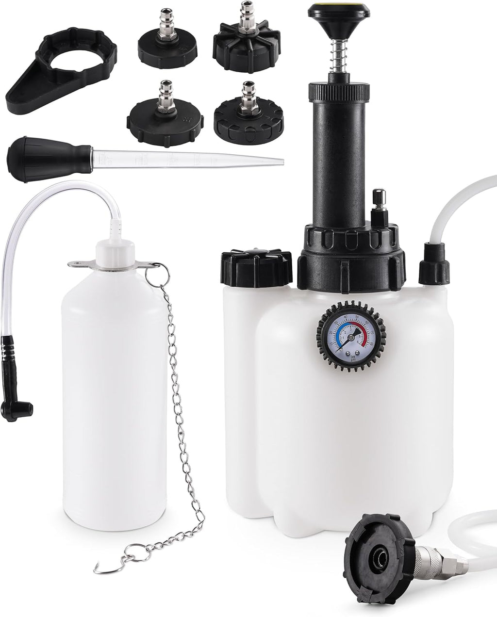 - Usage Guide: Tighten the adapter onto the master cylinder reservoir and pump to 10 psi to pressurize. Connect the rubber hose to the bleeder screw, press the brake pedal to flush fluid and air bubbles. Repeat until clean fluid flows.