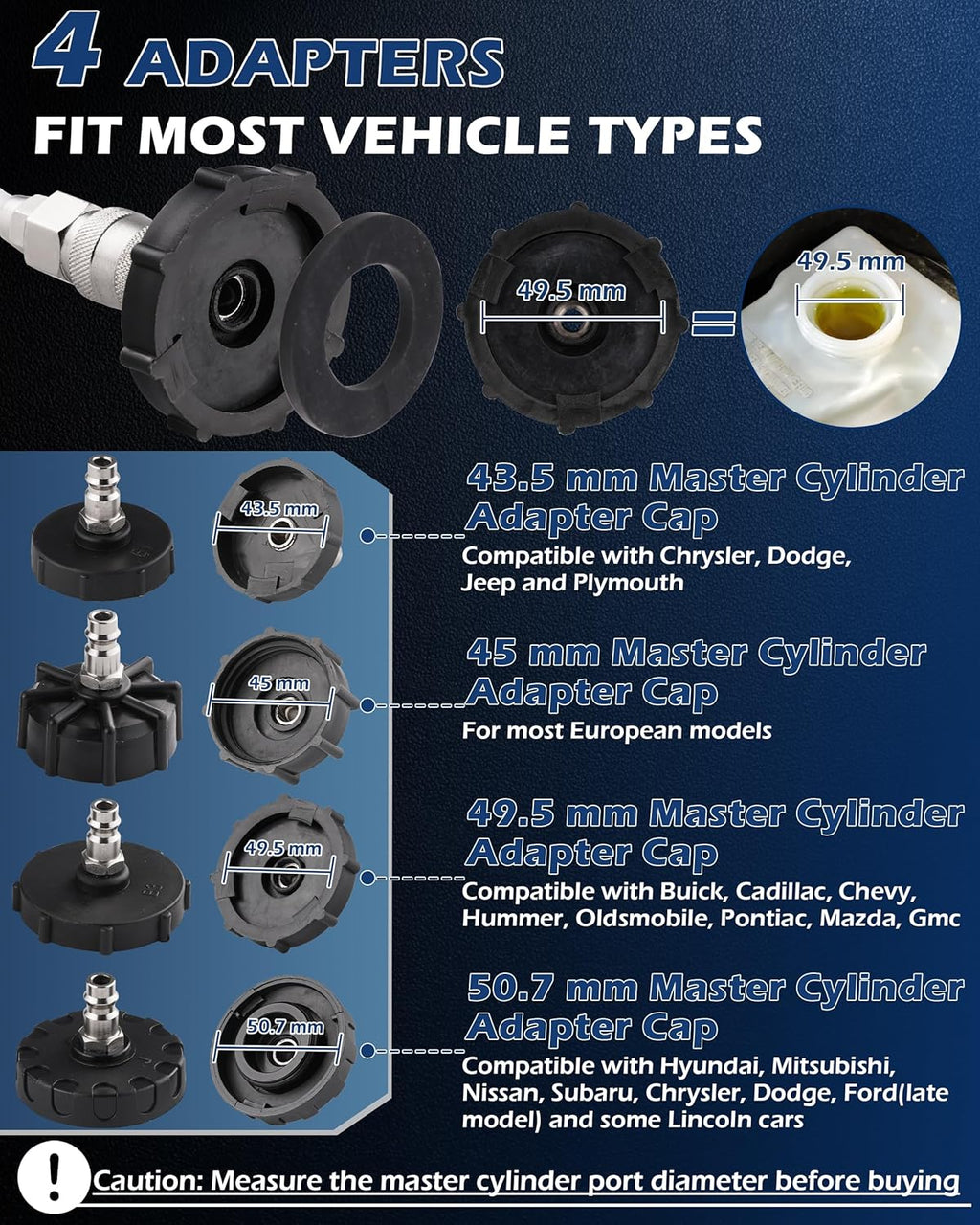 - Adapter Description: 43.5mm for Chrysler, Dodge, Jeep, and Plymouth; 45mm for most European cars; 49.5mm for some Mazdas and most late-model GM vehicles; and 50.7mm for most Hyundais. Please measure your vehicle’s master cylinder before purchasing to ensure a proper fit.